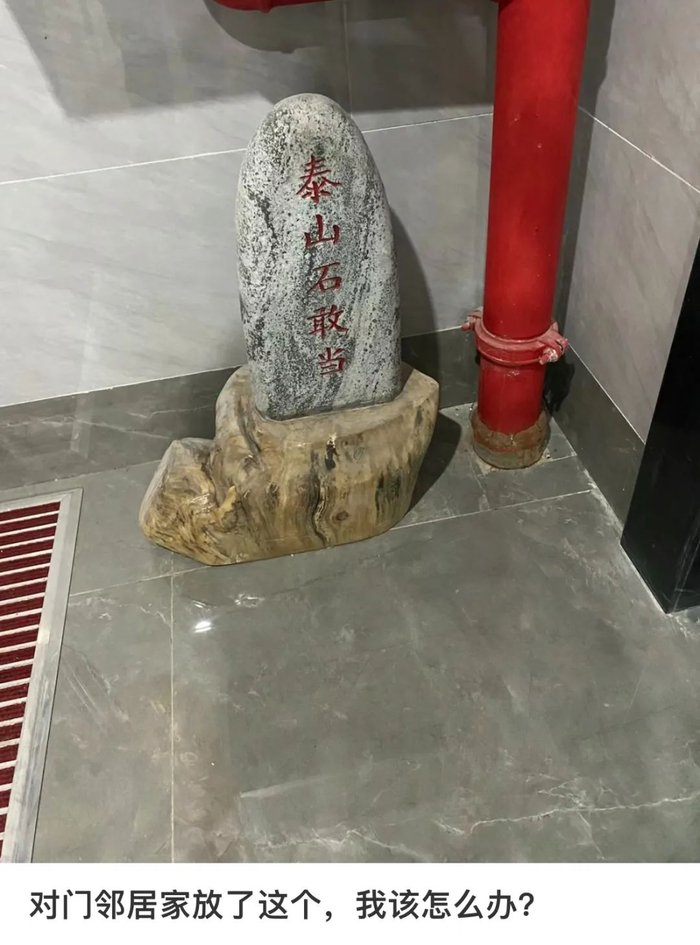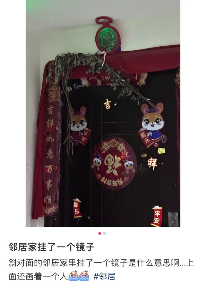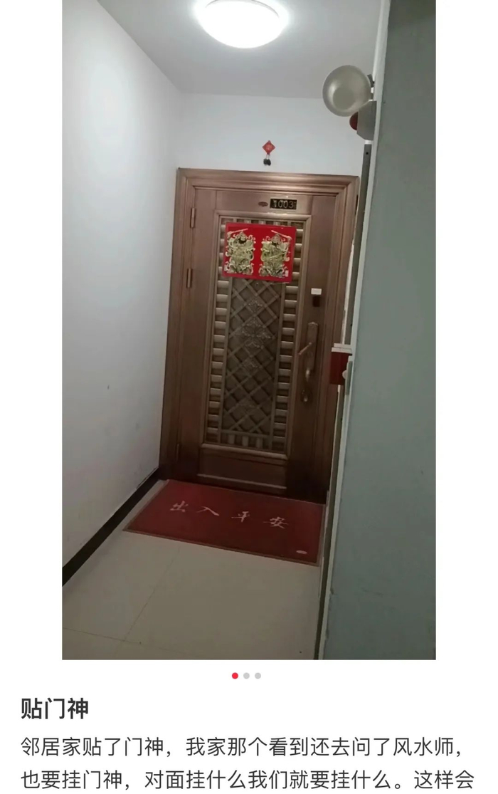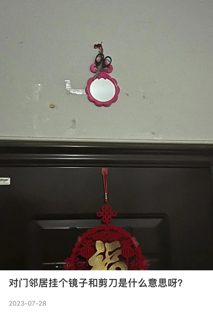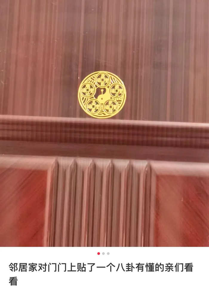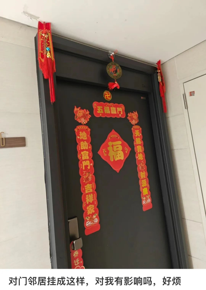 两门相对,其中一户人家,在门上贴了祈福辟邪的东西,或是想用道具化解“门门相对”造成的影响。但作为对门的那家见了,马上心中警铃大响。