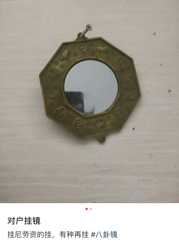 类似于「八卦镜」的道具,据称有驱邪避煞的功效,但却是双刃剑,或许也是因为其“镜”的特质,它被部分人认为会影响对门住户的运势——把邪煞反射给了对户。