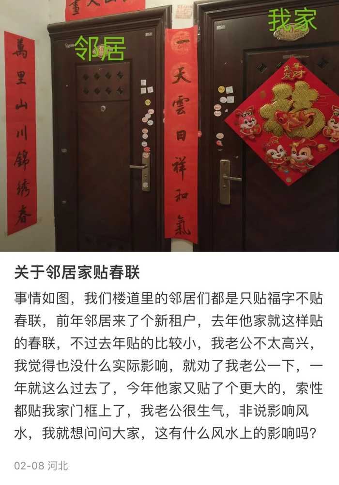 一般情况下,这种帖子内的情况差不多有三:邻居家春联更大、邻居家春联占了自家的墙面、邻居家春联压在我家春联上了。