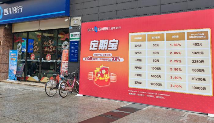 在四川银行成华支行,红星新闻记者注意到,银行大门外醒目地竖立着“定期宝”宣传牌。根据宣传牌上的信息,该行的3年期定期存款利率依然高达3.4%,而5年期定期存款在1万元以上的年利率更是高达3.8%。