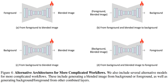 图 4 引入了几种替代架构,以实现更复杂的工作流程。研究者可以向 UNet 添加零初始化通道,并使用 VAE(有或没有潜在透明度)将前景、背景或图层组合编码为条件,并训练模型生成前景或背景(例如,图 4-( b,d)),或直接生成混合图像(例如,图 4-(a,c))。