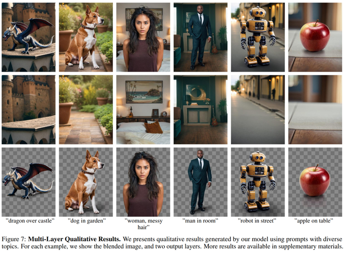 图 7 展示了使用具有不同主题的提示来生成图片的定性结果。每个示例会显示混合图像和两个输出层。这些图层不仅在照明和几何关系方面保持一致,而且还展示了稳定扩散的美学品质(例如,背景和前景的颜色选择,看起来和谐且美观)。