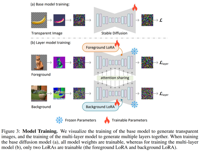 生成多个图层:该研究进一步使用注意力共享和 LoRA 将基础模型扩展为多图层模型,如图 3-(b) 所示。图 3-(a) 为训练可视化结果。