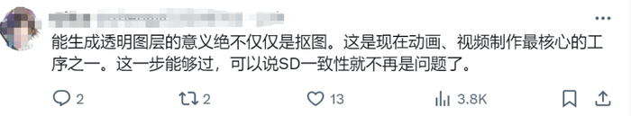 有网友表示:「能生成透明图层的意义绝不仅仅是抠图。这是现在动画、视频制作最核心的工序之一。这一步能够过,可以说 SD 一致性就不再是问题了。」
