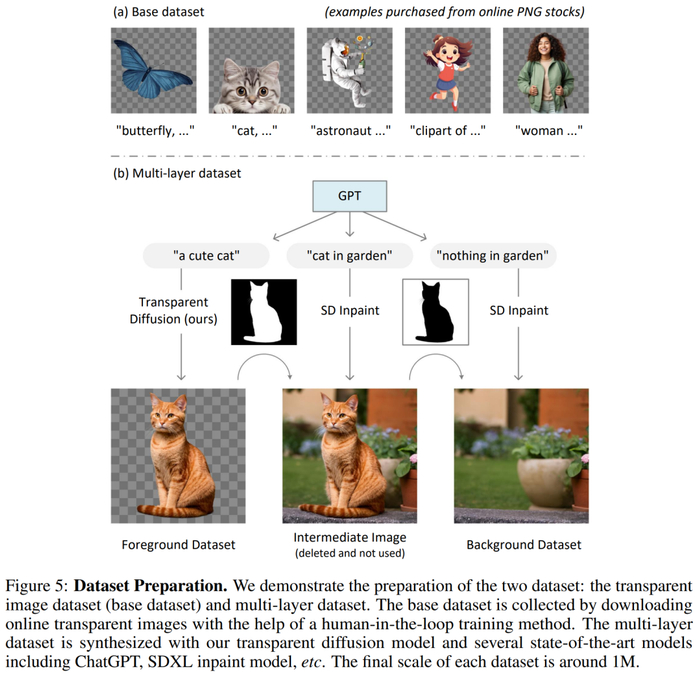 此外,本文还采用人机交互的方式来训练模型框架并同时收集数据,最终数据集的规模达到 100 万张透明图像,涵盖多种内容主题和风格。然后,该研究将数据集扩展到多图层样本。该数据集不仅可以训练透明图像生成器,还可以用于不同的应用,例如背景 / 前景条件生成、结构引导生成、风格迁移等。