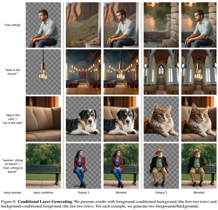 条件层生成。研究者在图 8 中展示了条件层生成结果(即以前景为条件的背景生成和以背景为条件的前景生成)。可以看到,本文的模型可以生成具有一致几何和照明效果的连贯构图。在「教堂中悬挂的灯泡」示例中,该模型尝试通过一种对称性审美设计来匹配前景。而在「坐在长登上或坐在沙发上」示例中,该模型可以推断前景和背景之间的交互,并生成相应的几何。