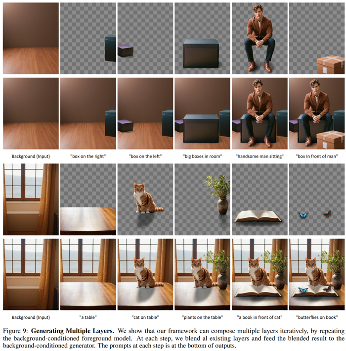迭代生成。如图 9 所示,研究者可以迭代使用以背景为条件的前景生成模型,以实现构图或任意数量的层。对于每个新的层,他们将之前生成的所有层融入到一个 RGB 图像,并馈入到以背景为条件的前景模型。研究者还观察到,该模型能够在背景图像的上下文中解释自然语言,比如在一只猫的面前生成一本书。该模型展现了强大的几何构图能力,比如生成一个人坐在箱子上的组合图像。