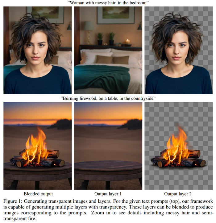 举例来说,对于给定的文本提示(如头发凌乱的女人,在卧室里),该研究提出的方法能够生成具有透明度的多个图层。也就是说该模型不仅能根据提示生成图片,还能将前景和背景进行分层,背景丢失的信息也能很好的补充。