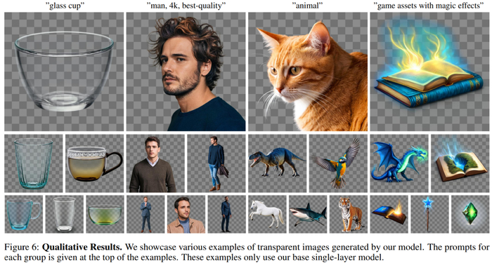 图 6 展示了使用单图像基础模型生成的图像定性结果。这些结果展示了该模型可以生成原生透明图像,如生成高质量的玻璃透明度、头发、毛发、发光、火焰、魔法等效果。这些结果还证明了该模型可以泛化到不同的场景。