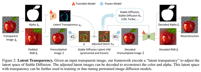 本文的目标是为像 Stable Diffusion (SD) 这样的大规模潜在扩散模型添加透明度支持,这些模型通常使用一个潜在编码器(VAE)将 RGB 图像转换为潜在图像,然后再将其输入到扩散模型中。在此过程中,VAE 和扩散模型应共享相同的潜在分布,因为任何重大不匹配都可能显著降低潜在扩散框架的推理 / 训练 / 微调性能。