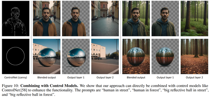 可控生成。如图 10 所示,研究者展示了 ControlNet 等现有可控模型可以用于他们的模型,以提供丰富的功能。可以看到,本文的模型可以基于 ControlNet 信号来保留全局结构,以生成具有一致照明效果的和谐构图。研究者也通过一个「反射球」示例展示了本文的模型可以与前景和背景的内容进行交互,从而生成反光等一致性照明效果。
