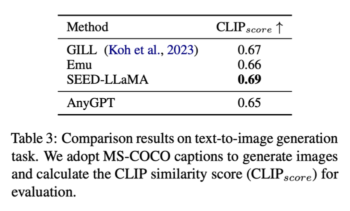 该研究评估了 AnyGPT 在图像描述任务上的图像理解能力,结果如表 2 所示。