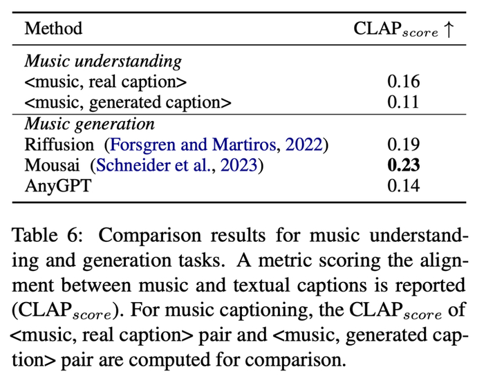 该研究在 MusicCaps 基准上评估了 AnyGPT 在音乐理解和生成任务方面的表现,采用 CLAP_score 分数作为客观指标,衡量生成的音乐和文本描述之间的相似度,评估结果如表 6 所示。