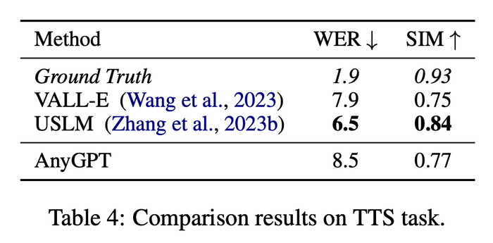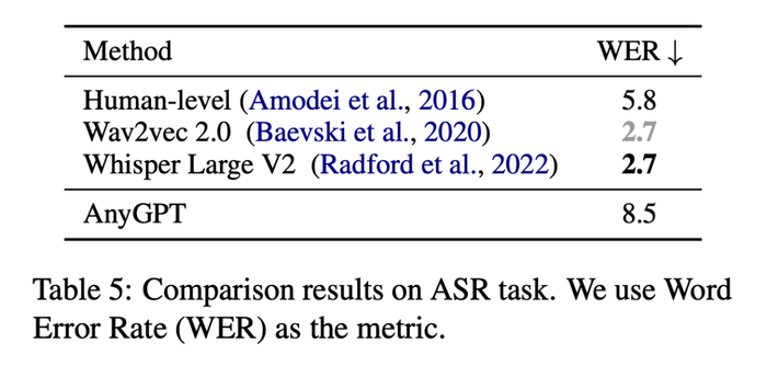 该研究通过计算 LibriSpeech 数据集的测试子集上的词错误率 (WER) 来评估 AnyGPT 在自动语音识别 (ASR) 任务上的性能,并使用 Wav2vec 2.0 和 Whisper Large V2 作为基线,评估结果如表 5 所示。