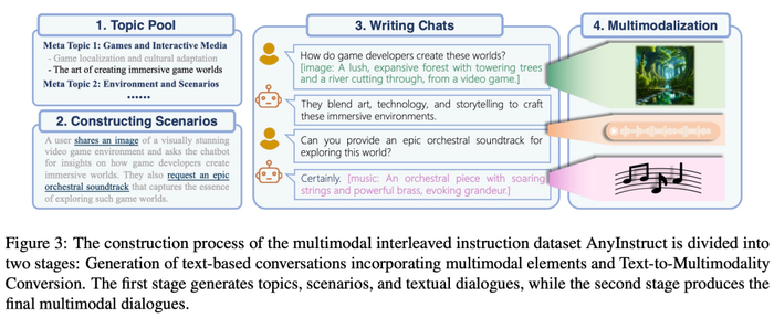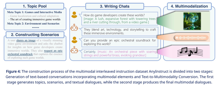 这项研究的一个关键挑战是缺乏多模态交错指令跟踪数据。为了完成多模态对齐预训练,研究团队利用生成模型合成了第一个大规模「任意对任意」多模态指令数据集 ——AnyInstruct-108k。它由 108k 多轮对话样本组成,这些对话错综复杂地交织着各种模态,从而使模型能够处理多模态输入和输出的任意组合。