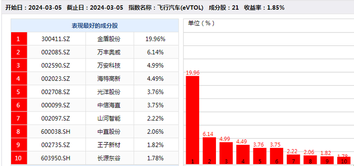 3月5日,飞行汽车概念股领跑题材板块。截至收盘,金盾股份涨停,万丰奥威、光洋股份、山河智能等跟涨。