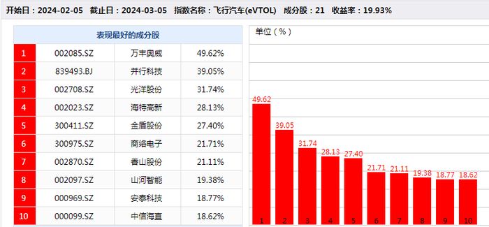 同花顺iFinD数据显示,A股市场上,目前布局飞行汽车业务的公司超过20家。2月以来,飞行汽车概念股整体大幅反弹。其中,万丰奥威、光洋股份、海特高新、山河智能、安泰科技等涨幅居前。