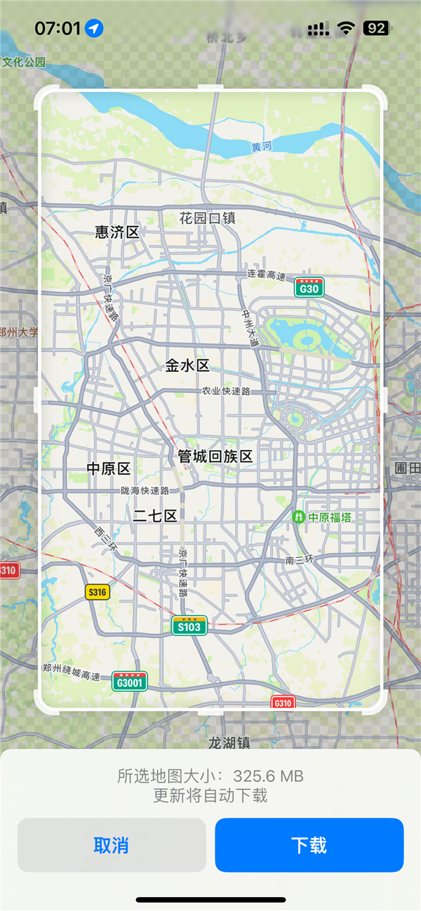 3、根据需要,调整想要包含在离线地图中的区域,然后再次轻点“下载”。