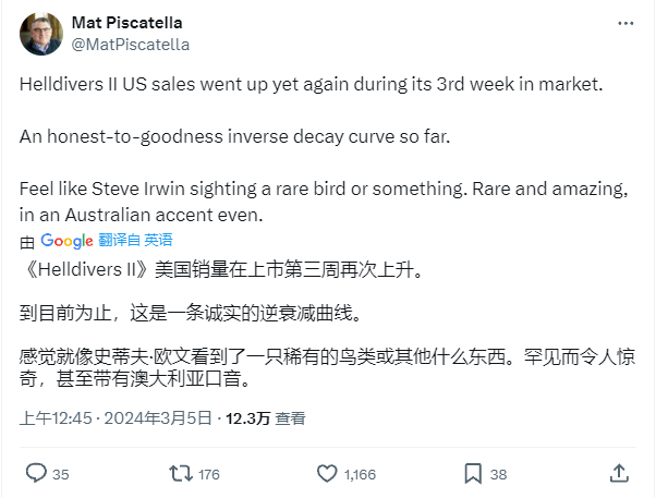 3月5日,数据分析网站Circana的执行董事马特•皮斯卡特拉(Mat Piscatella)发推表示,《绝地潜兵》在美国的第三周销量还在上升,呈现出了一条“诚实至善的逆衰减曲线”。