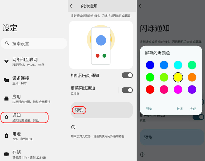 通知:新增闪烁通知功能,收到新通知时可通过相机闪光灯或屏幕闪烁提示;