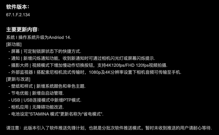 IT之家 3 月 6 日消息,索尼 Xperia 1 V、Xperia 5 V 手机推送安卓 14 操作系统更新(Xperia 1 V 版本为 67.1.F.2.134,Xperia 5 V 版本为 67.1.F.2.134),该版本针对系统进行了优化,带来了部分新功能。