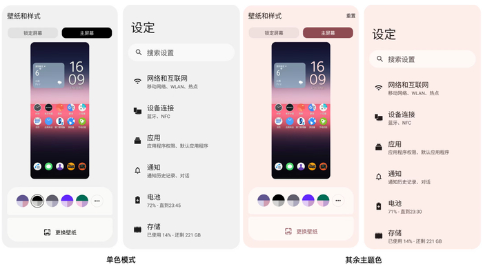 壁纸和样式:新增系统颜色和单色主题;