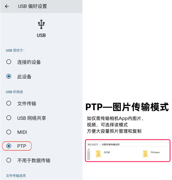 USB:USB 连接模式中新增 PTP 模式;