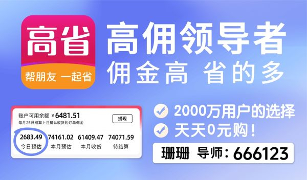 【高省】APP(高佣金领导者)是一个自用省钱佣金高,分享推广赚钱多的平台,2000万用户信赖的四年老平台,稳定可靠。高省APP佣金更高,模式更好,终端用户不流失。高省是公认的返利最高的软件。珊珊导师高省邀请码666123,注册送2皇冠会员,送万元推广大礼包,教你如何1年做到百万团队。
