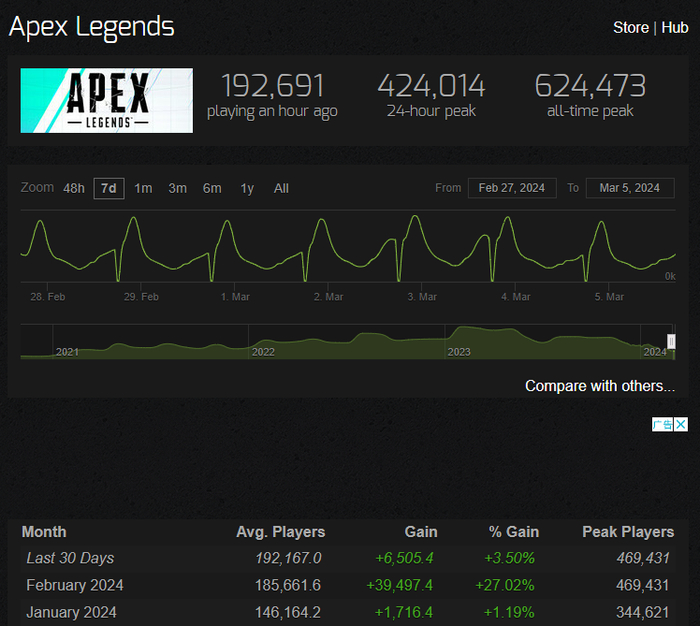 根据Steamcharts网站数据,今年2月以来,APEX的在线玩家峰值显著回升,这款持续运营5年之久的游戏还在迸发生机。正如第20赛季定下的名字,重生和APEX积极求变,完成了自己的新一轮“突破”。