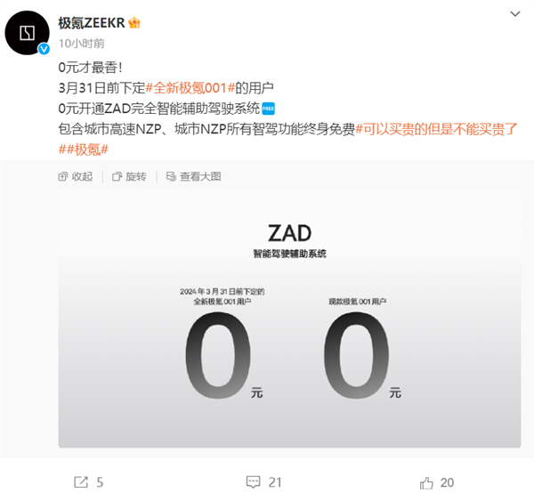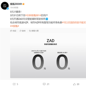 现款极氪001用户也可享受此项福利,而极氪ZAD智驾系统,此前官方售价为35000元。