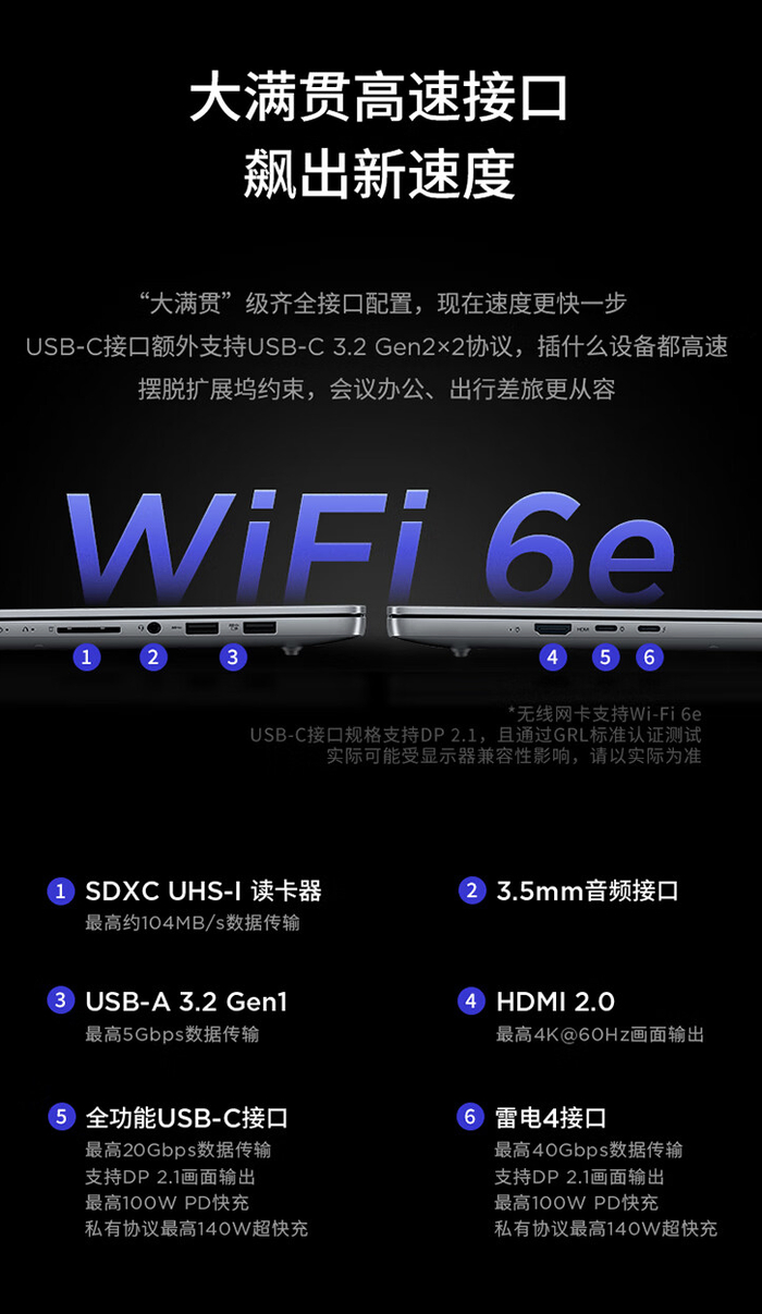 此外,系列笔记本支持 IR+ToF 人脸识别解锁,配备双扬声器,支持 Wi-Fi 6E 技术,拥有 SDXC 读卡器接口、3.5mm 音频接口、2 个 USB Type-A 3.2 Gen 1 接口、1 个 HDMI 2.0 接口、1 个全功能 USB-C 接口、1 个雷电 4 接口。