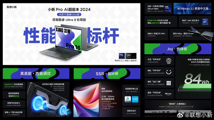 联想预热“Ultra 9-185H”版小新 Pro 16 2024 款笔记本:4 月发售、性能释放约 80W
