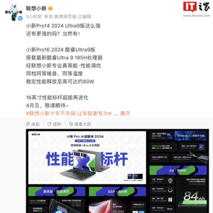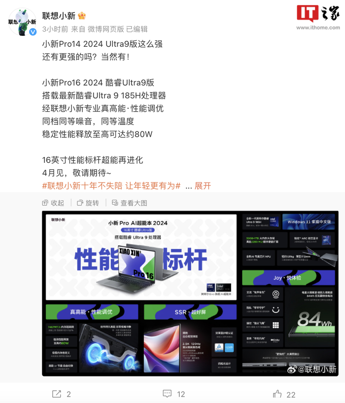 IT之家 3 月 10 日消息,据联想小新官方微博,联想将在 4 月推出酷睿 Ultra 9-185H 版小新 Pro16 2024 款笔记本,号称稳定性能释放至高可达约 80W。