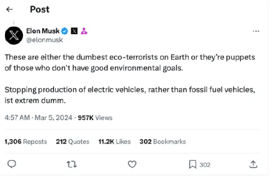 愤怒的马斯克在X平台直接开骂,“这群人要么是地球上最愚蠢的环保恐怖分子,要么就是被没有良好环保目标的人操纵了。停止生产电动车,继续使用化石燃料车辆,才是最大的蠢货”。