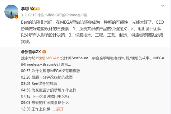 3月2日,李想还在微博上转发了主导MEGA设计的理想高级设计总监Ben Baum的专访,称CEO协助做好造型设计的三要素:1、负责共识该产品的价值定义;2、阻止设计团队以外所有人影响设计决策;3、说服技术、工程、工艺、制造、供应链等团队必须实现。