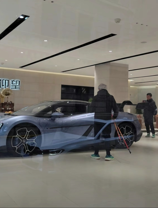 他站在窗户外面,仔细观摩仰望U9,还拿出了手机,从不同的角度拍摄这款中国超跑。