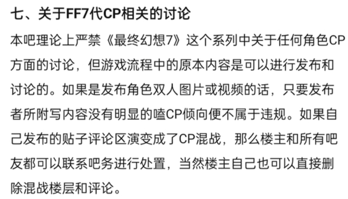 总的来说,“最终幻想7吧”和“FF7吧”各执一词,各有各的道理,假如你是一位对CP无感的中立玩家,想必多半也会在两家粉丝的轮番轰炸中对自己的信念产生动摇。至于主吧“最终幻想吧”,早在几年前的吧务大换血过后就已明令禁止FF7的CP讨论,自然也就少了许多骂战与争议。