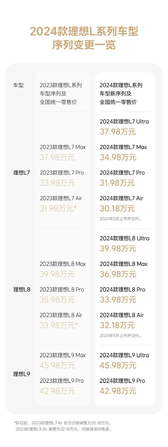 理想调整2024款车型序列命名,2023款理想L7Air、L8Air售价下调1.8万元