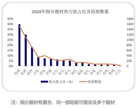 《报告》中提到,2024年以来,情感、逆袭、战神包揽热投细分题材榜前三,投流热度遥遥领先,古装、甜宠位列第四、第五,此前火爆的赘婿、神豪题材热度跌出前十。