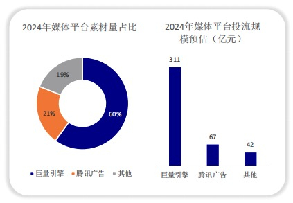 《报告》中提到,抖音旗下的巨量引擎是短剧投流素材第一大平台,2024年以来素材量占比约6成,腾讯广告约占2成,其他媒体平台占2成左右。按投流消耗占比分析,巨量引擎也是短剧投流消耗第一大平台,2024年以来投流消耗约占74%,腾讯广告约占16%,其他媒体平台约占10%。