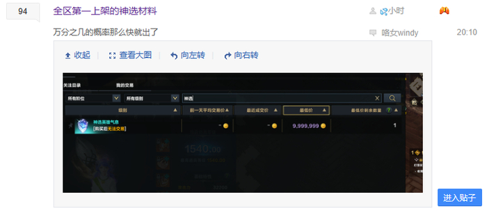 像是随着新难度副本上线的稀有强化材料“神选英雄气息”,一旦在拍卖行里出现,以及价格发生的波动,都会在玩家间引起热烈讨论