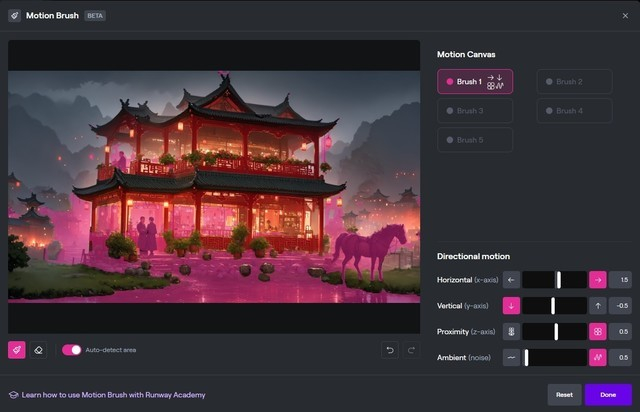 甚至还有助你变成赛博版神笔马良的MotionBrush运动笔刷,仅需涂抹想得到运动效果的区域,便可实现特定区域内的动态效果,真正实现通过提示词新增画面动态元素的AI功能。