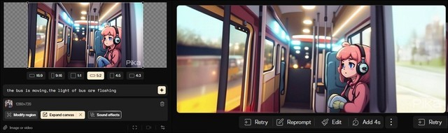 从实测效果看来,PIKA图生视频的功能对于提示词的还原和原图像的结合还是较为符合视觉观感的,窗外的车辆行驶、灯光的闪烁和头发的抖动令图像具备了动态生命力。