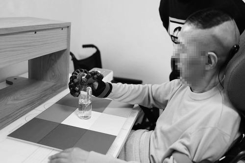 在他的家里,摄像机记录了他戴着气动机械手套抓握起一瓶橙汁饮料的画面。看得出来,老杨很高兴,这对他而言是一个质的变化——他已经10多年不能自己喝水吃饭了。