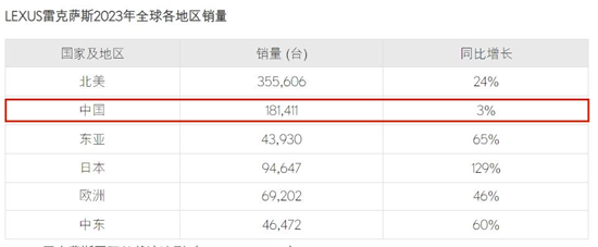 分区域来看,雷克萨斯各个市场均实现了增长,扭转了2022年的惨淡局面。其中,在日本本土市场,雷克萨斯售出94647辆,同比增长129%;北美市场全年销量同比增长24%达35万辆;但值得注意的是,在海外第二大市场中国,雷克萨斯售出181411辆,较前一年增长3%,虽然止住了2022年的下滑趋势,但依然远低于整体、北美及本土市场增幅。