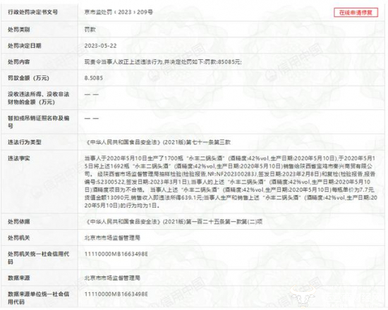 据悉,上述“永丰二锅头酒”每瓶单价为7.7元,货值金额13090元,销售收入即违法所得639.1元。由于北京二锅头生产和销售上述不合格产品的行为均为1日,北京市市场监督管理局认为其违反了《食品安全法》(2021版)第七十一条第三款,责令改正并罚款85085元。