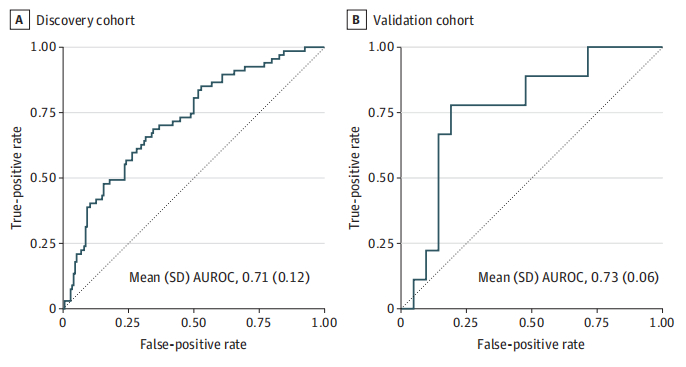 最终模型由17种生物标志物组成。基于生物标志物的模型显示,发现队列中区分BD和MDD的曲线下面积为0.71(0.12;p<0.001),验证队列在模型中的曲线下面积为0.73(0.06;p<0.001)。