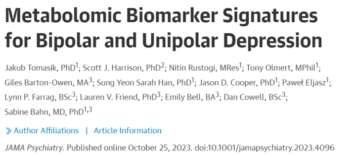 [2] Tomasik J, Harrison S J, Rustogi N, et al. Metabolomic Biomarker Signatures for Bipolar and Unipolar Depression[J]. JAMA psychiatry, 2023.