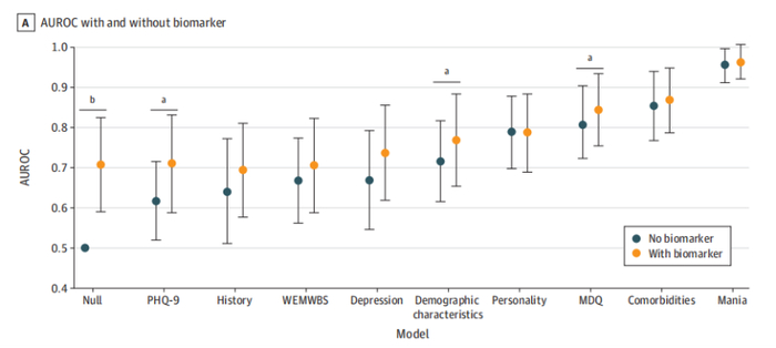 研究结果表明,将生物标志物纳入基于患者自我报告数据的诊断模型中,可以增加模型区分情绪低落期间BD和MDD患者的能力,并可能带来临床相关改善。生物标志物主要与躁狂症状相关,也与之前观察的结果一致。