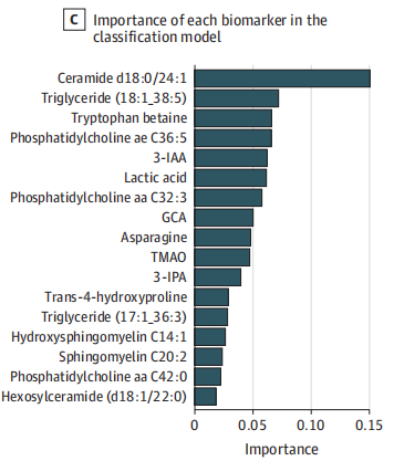 近日,英国剑桥大学的Sabine Bahn及其研究团队收集了241名BD或MDD患者干血斑代谢组数据,发现其中17种代谢物可以作为区分BD和MDD的生物标志物,其中,神经酰胺d18:0/24:1关联性最强[2]。